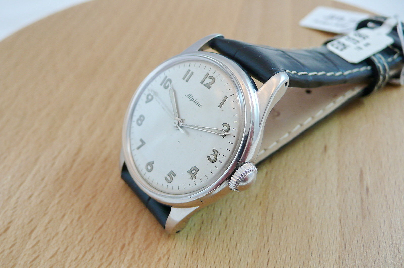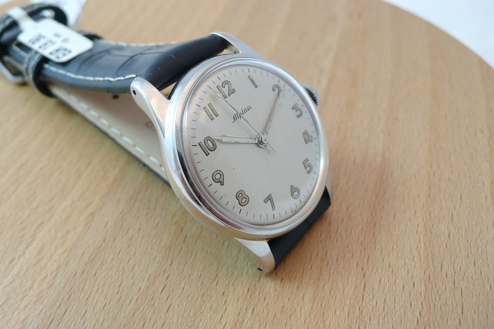 The Real Vintage Look: Alpina Manual Wind, Beautiful Dial With Luminous Hands and Numerals, Central Second Hand with Luminous Arrow, Stainless Steel Case with Screw Back, Swiss High Quality Movement Signed Alpina, Cal. 598, Protected by a Dust Cover, Case Diameter 34mm (not Counting Crown), ca. 1950