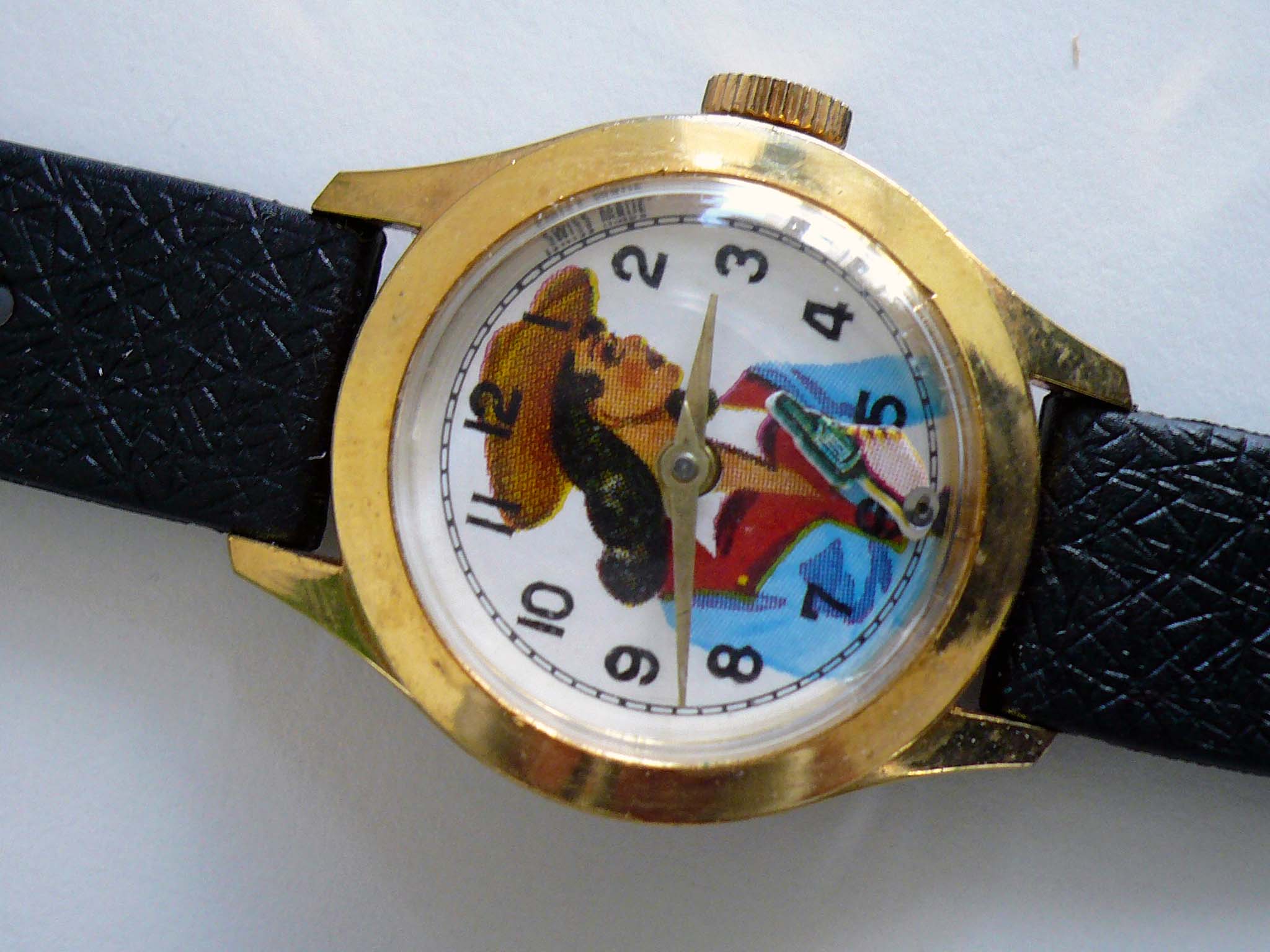 Annie Oakley (Is it her? Mail who can confirm or give information will be appreciated!) Character watch, Action gun: moves up and down when watch runs, Boy's size (Diameter 27,5mm without crown), ca. 1955