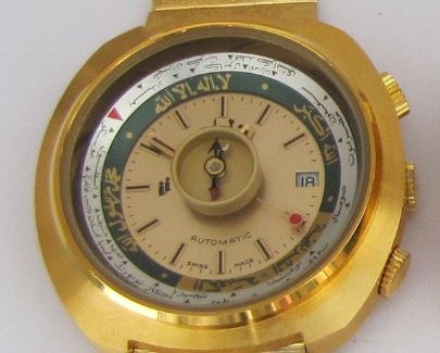 An Rare and Interesting Item: Big Dalil Swiss Automatic Mechanical Moslem Watch with Various Features, qiblat/compass, black dial with major cities and quranic verses with date window at 3, in excellent condition, never used. Heavy gold filled case measures approximately 40mm excluding the crowns and 42mm lug to lug. Signed crowns. Original band fits 8.5" wrist, Original Instruction Manual, ca. 1970
