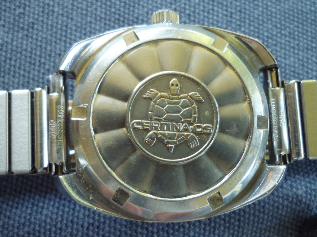 Impressive Certina DS Automatic, Green Dial, Weekday and Date Window at 3, Orange Center Second Hand, Massive Stainless Steel Case with Turtle Screw Back, Case Size 38x43mm (not Counting the Crown), Metal Bracelet not original, ca. 1970
