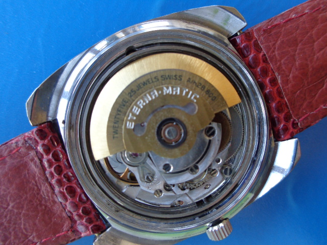 Cool Eterna-Matic Stainless Steel Automatic, Striking Red Dial, Date Window at 3, Cushion Shaped Case with Screw Back, Inscription on Back has been polished out, Famous Eterna-Matic Movement Cal. 2824, Case Size 40x37mm (not Counting Crown), ca. 1970
