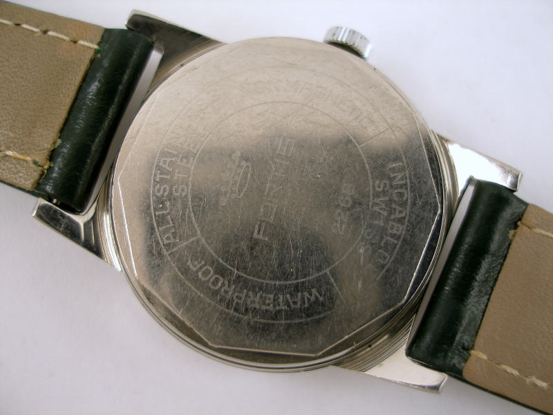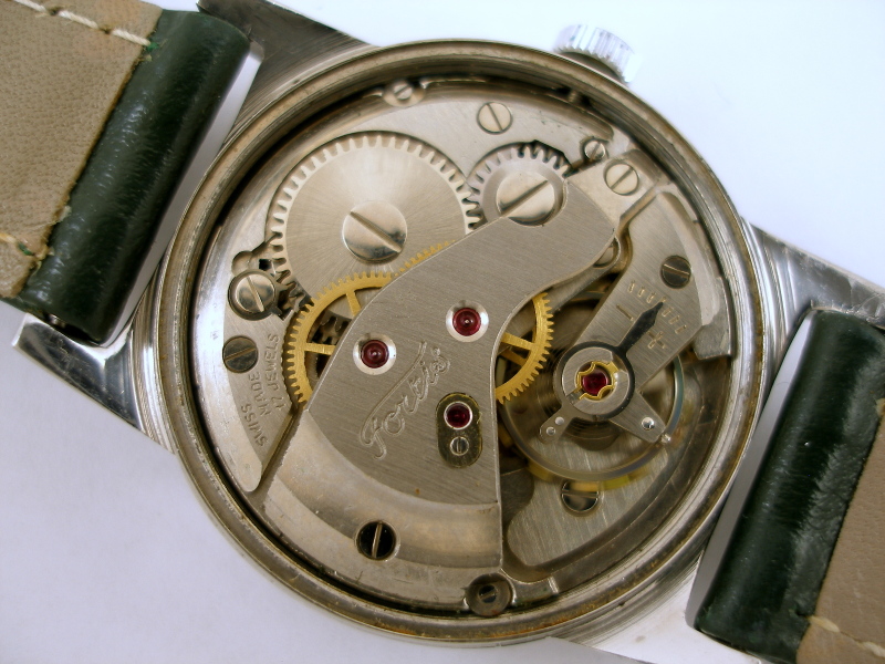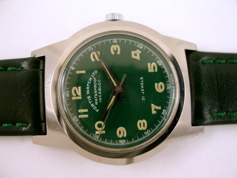 Extravagant Fortis Manual Wind, Attractive Green Dial with Luminous Hands and Numerals Signed "Fortis Watch Ltd." "Waterproof" "Incabloc", Stainless Steel Case with Screw Back, Slight Signs of Age (see pictures), Swiss Movement with the Fortis Logo, Case Diameter 31mm (not Counting Crown), 36,5mm Lug to Lug, ca. 1950, with green Leather Band "Rios Arizona Germany"