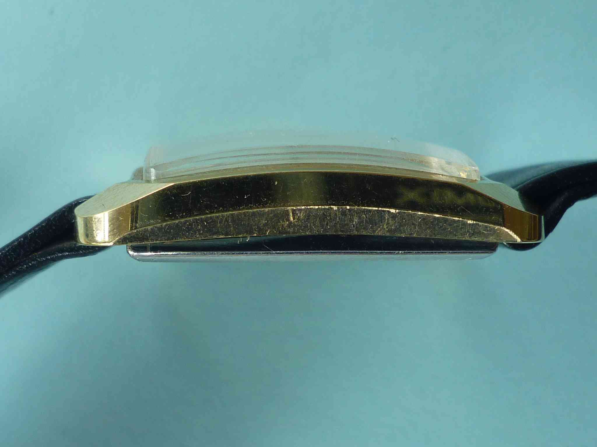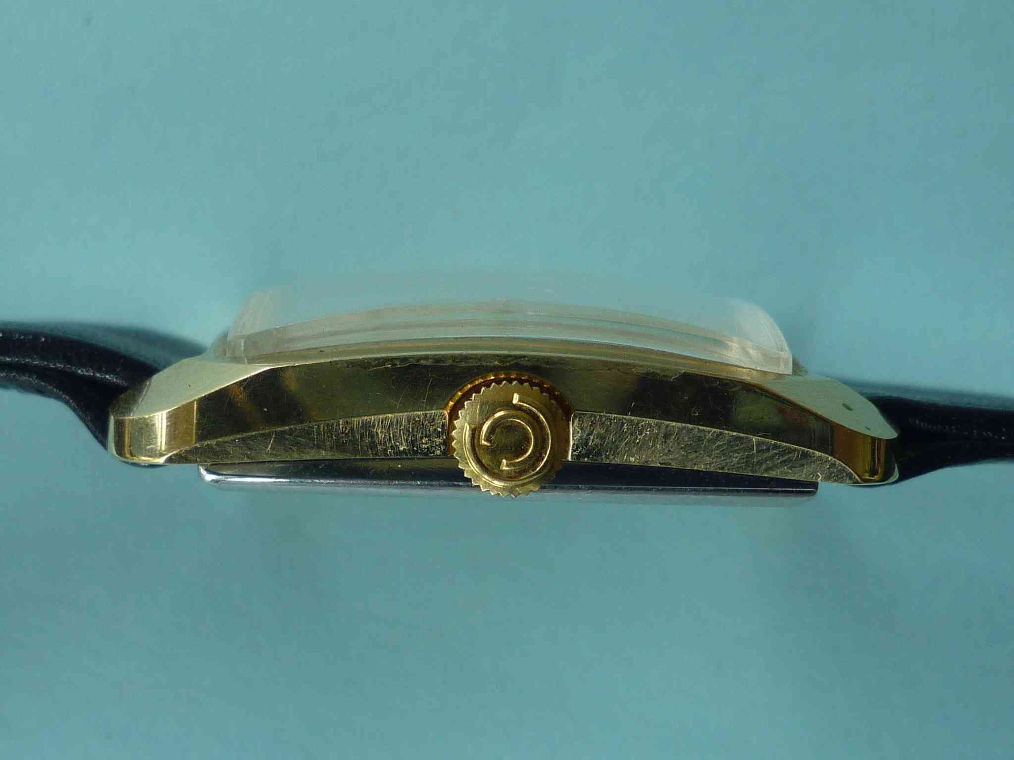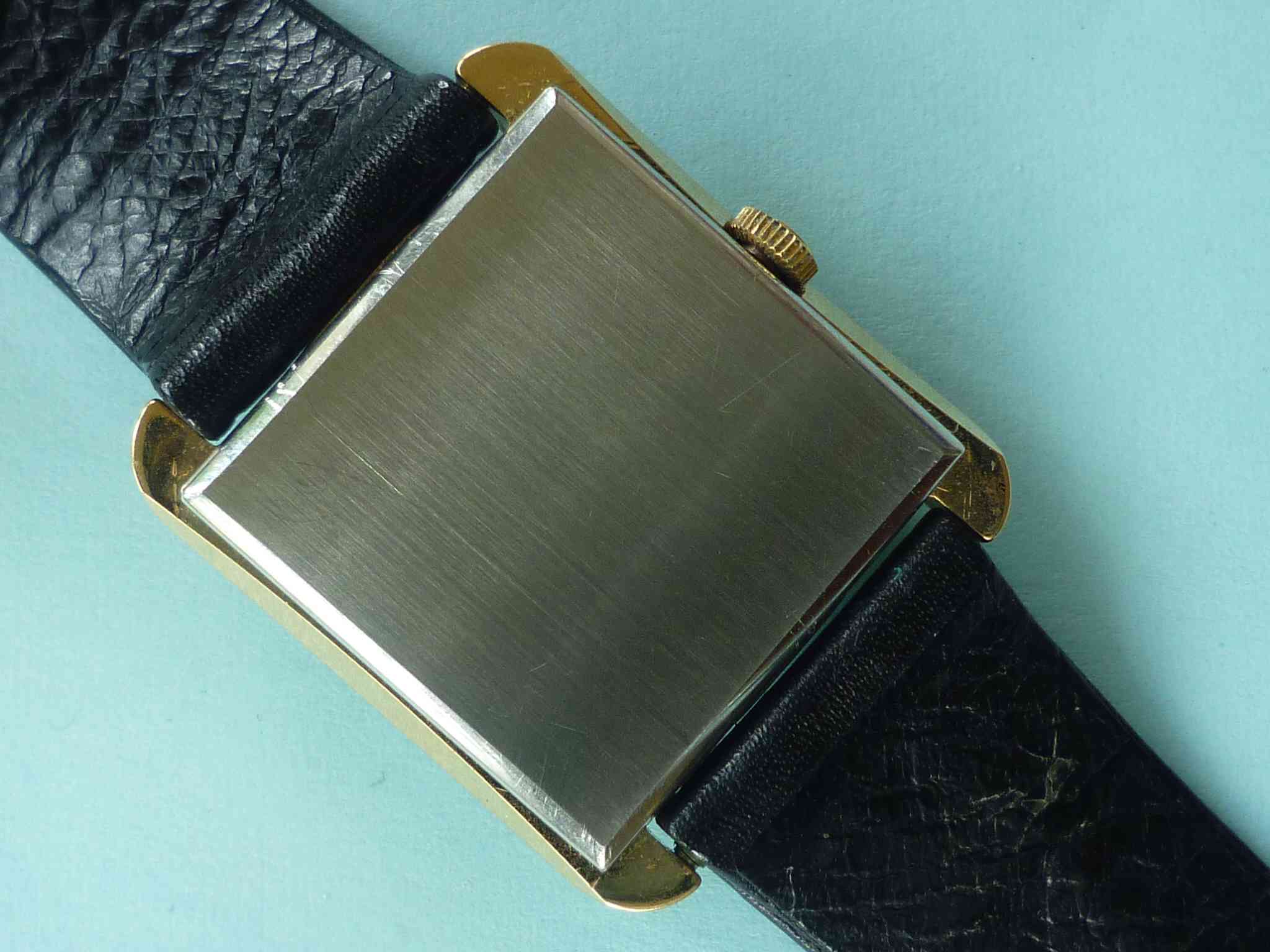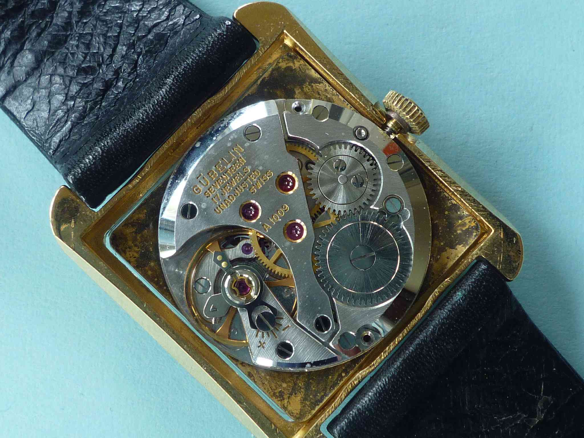 Elegant Square Gubelin Gold Filled Manual Wind, Classy Dial Signed "Gubelin", Case with Snap Back, Swiss High Grade Movement Signed "Gubelin", Cal. A1009 with 17 Jewels, Gold Jewel Settings, Case Size 33x29mm, Half Hidden Crown, ca. 1960