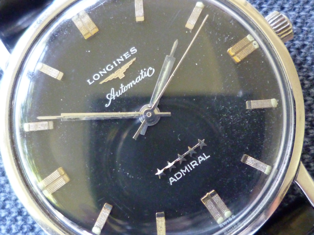 Big Elegant Longines "Admiral" 5 Star Automatic, Great Black Dial, Stainless Steel Single Shell "Monocoque" Case (Opens from Upside), Case Diameter 34,5mm (not Counting the Crown), ca. 1965