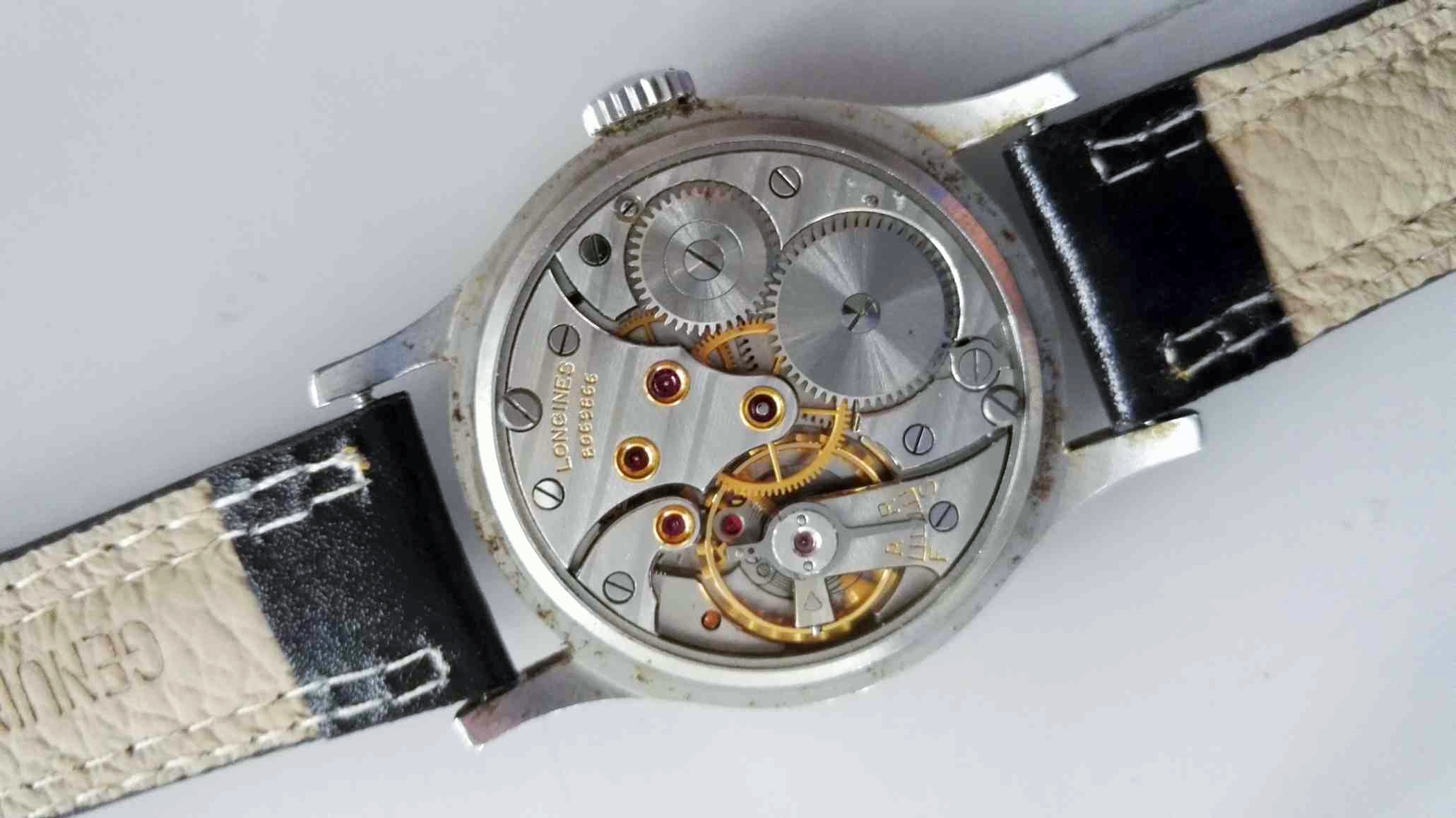 Pretty Longines (sold by Turler, still one of Zurich's most prestigious Jewelers) Manual Wind, Silver White Dial with some Cool Patina, Small Second Hand, Art Deco Numerals, Stainless Steel Case with Snap Back, Inscription on Back ("To Mister Ernst Anderegg in Reconnection of 25 Years of Faithful Service by the Management of the Engeneering Works Oerlikon, Dec. 1952"), Swiss High Grade Movement with Gold Jewel Settings, Case Diameter 32.5mm (not Counting Crown),