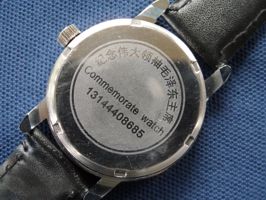 To me this is rather a Gag: Mao Zedong Commemorate Watch, Stainless Steel Case with Screw Back, the Arm Moves up and Down when the Watch is Running, Mechanical Manual Wind Movement, Center Second Hand, Case Diameter 34,5mm (not Counting Crown)