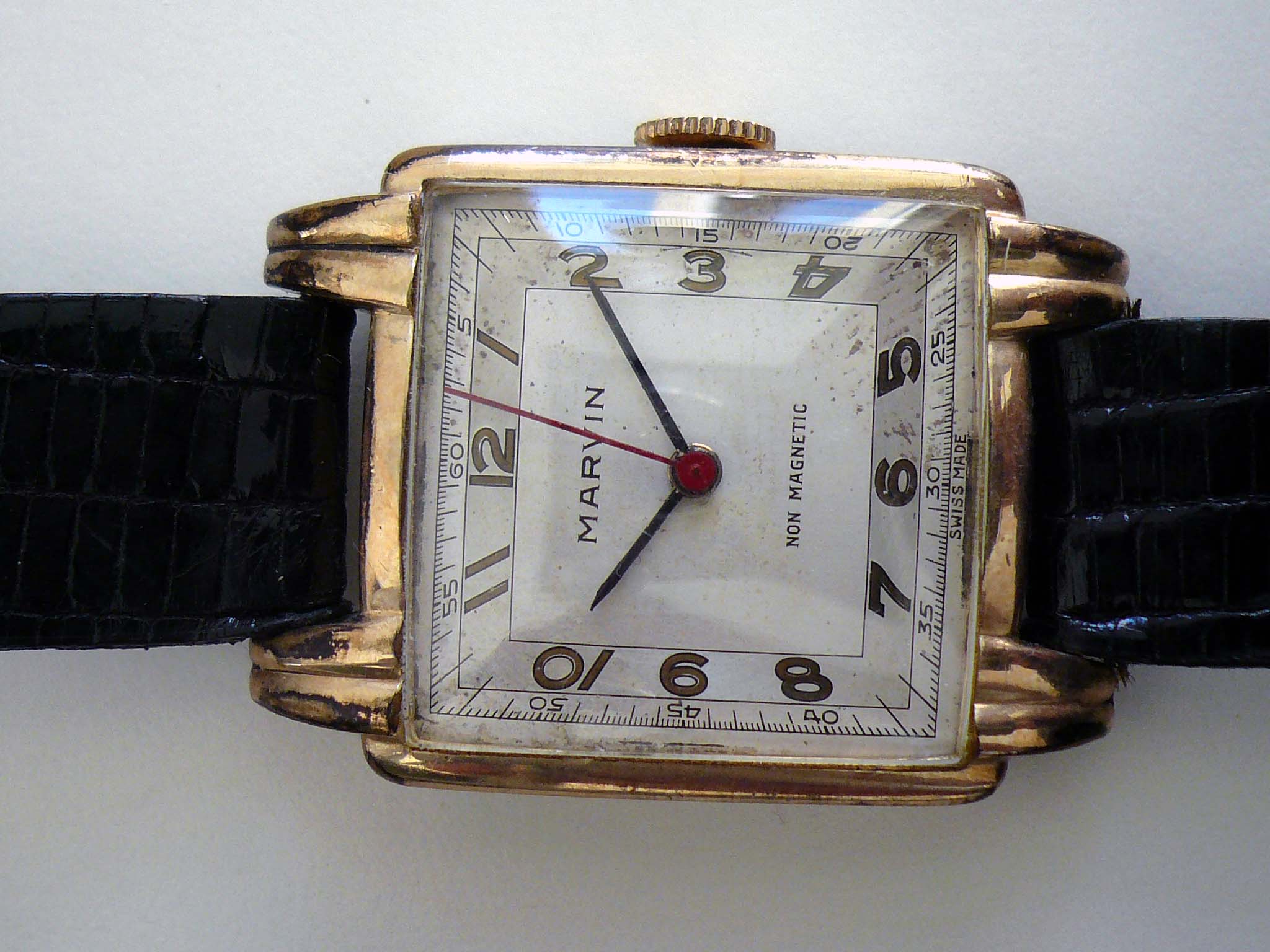 Marvin Fancy Rectangular Gold Filled Case, Manual Wind, Stainless Steel Snap Back, Red Second Hand, Dial shows slight age