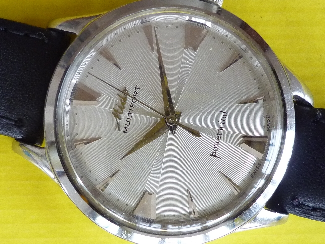 Exquisite Mido "Multifort Powerwind", Stainless Steel Case with Screw Back, Playful Silver Dial with attractive Pattern, Case Diameter 33.5mm (not Counting Crown), ca. 1960