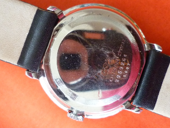Mido "Ocean Star Powerwind" Automatic, Attractive Black Dial, Stainless Steel Monocoque (1 Piece) Case, Case Diameter 35mm (not Counting Crown), Hidden Crown not original, tiny fissure in Crystal at 2, ca. 1965