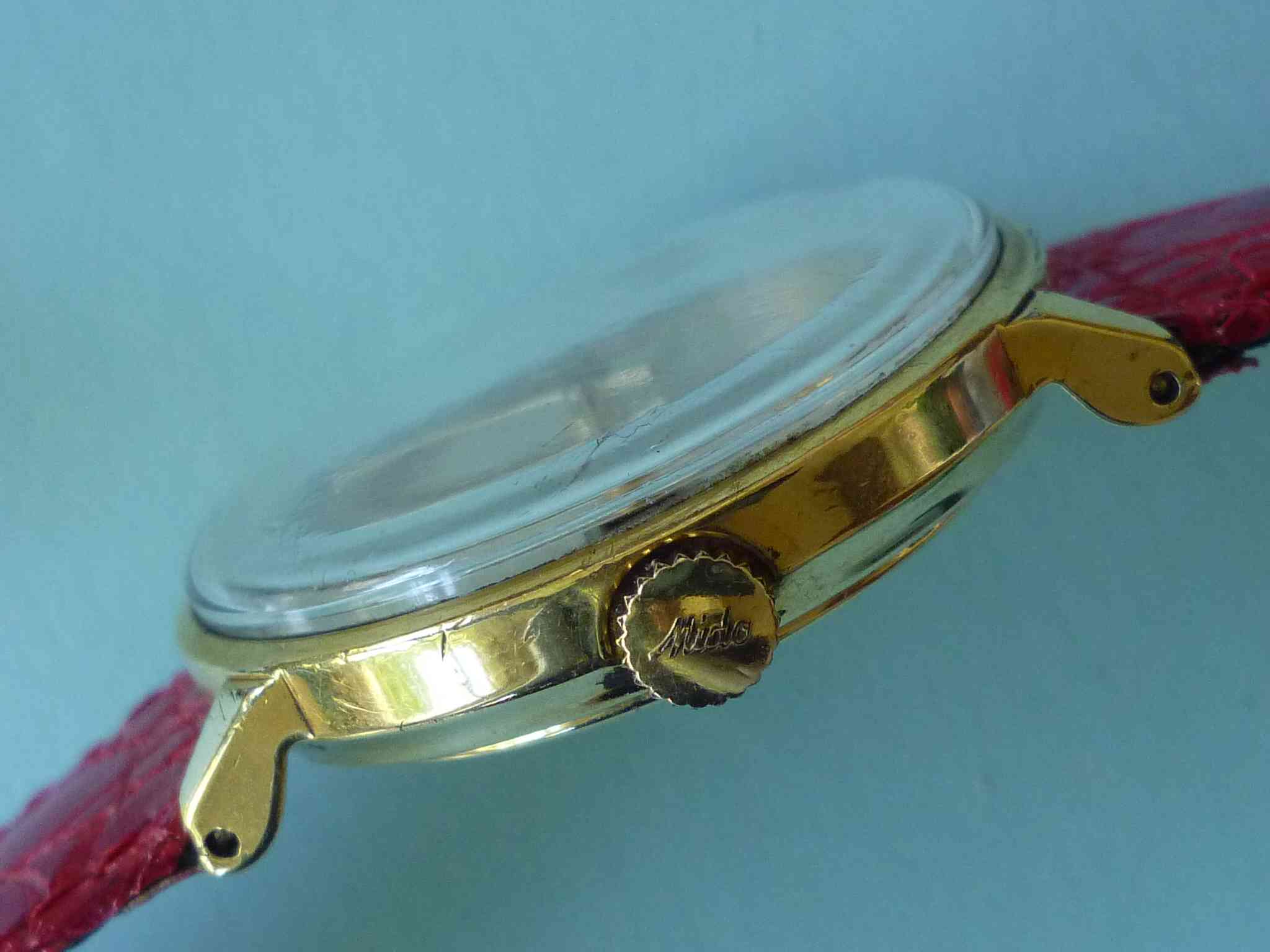 Another great looking Mido: Gold Plated "Ocean Star Powerwind" Automatic, Special Dial with Arabic Numbers 6/9/12, Date at 3, Monocoque Case, Diameter 33mm, Hidden Crown, Inscription on Back (see Picture), ca. 1965
